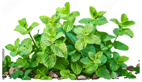 A detailed illustration of a fresh green mint plant with serrated leaves and visible veins on a white background