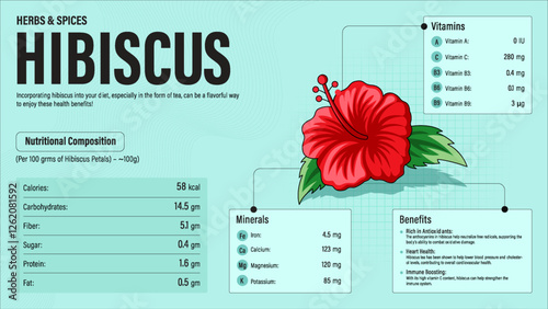 Hibiscus Herb Nutrition Facts and Health Benefits–Detailed Vector Infographic for Healthy Eating and Wellness