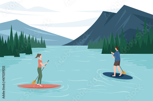 Enjoy active lifestyle with paddleboarding adventure, woman on water, summer fun, vector illustration