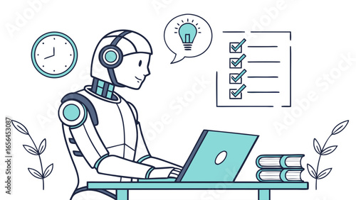 Robot alongside a checklist with tasks. Ideal for automation, robotics, workflow, AI management, productivity, technology, efficiency concepts. Simple flat metaphor