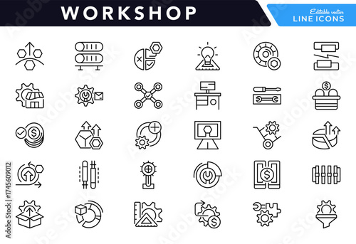 Operations management related icons set. Including process, planning, workflow, logistics, supply, strategy, production, and efficiency. Editable stroke. outline icons.