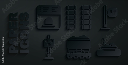 Set Coal train wagon, Cafe and restaurant location, Train traffic light, Plate with food, Railway, railroad track and Ticket office to buy tickets icon. Vector