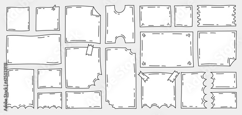 Set of cute cartoon paper stickers, tickets, reminders, templates, borders and frames. Vector backgrounds for drawings, text or lettering.