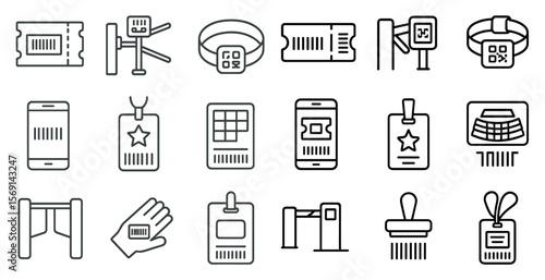 Set of icons for various items related to travel and identification. The icons include a ticket, a badge, a wristband, a phone, a glove, a ticket machine, a ticket scanner, and a ticket booth
