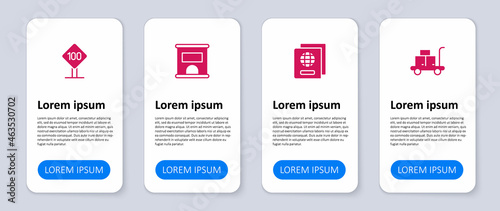Set Trolley suitcase, Passport, Ticket office to buy tickets and Speed limit traffic sign 100 km. Business infographic template. Vector