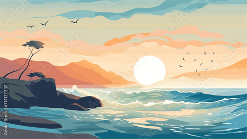 Convey the elemental forces shaping the coastal landscape in a vector scene featuring scenes of windswept shores tidal movements and the natural erosive processes contributing to the ever-changing