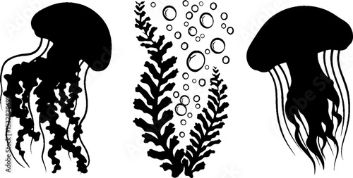 Jellyfish silhouettes with marine waves and bubbles for ocean-themed design