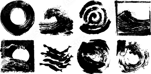 Black ink silhouettes of water and ocean waves collection for design and art projects