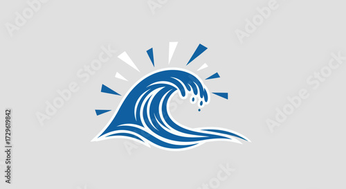 Stylized Blue Ocean Wave with Radiant Sunburst Symbol.