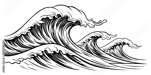 Detailed black and white drawing showcasing multiple ocean waves with intricate line work and dynamic movement created with generated ai