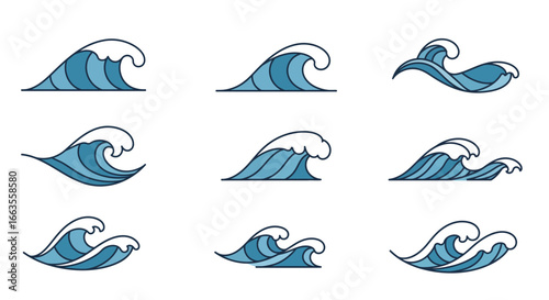 Wave icon set. Cartoon vector illustration collection. Ocean sea water swirl and splash symbol. Surf liquid flow motion. Marine nature element. Blue tidal storm or tsunami graphic.
