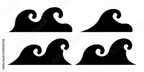 Four stylized black waves arranged symmetrically on a white background creating a simple pattern design | editable eps vectors silhouette