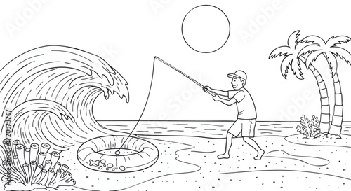 Vector line art for a coloring page featuring a man fishing on a tropical beach as a giant wave approaches, an exciting summer vacation activity