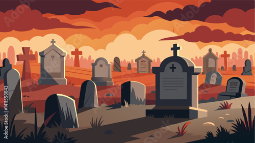 The cemetery with its weathered headstones tells a tragic tale of the lives lost to hunger and desperation in this forsaken village.. Vector illustration