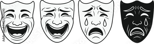 Collection of black theatre masks depicting comedy and tragedy emotions, isolated on a white background. Symbols of drama, acting, and performance arts.
