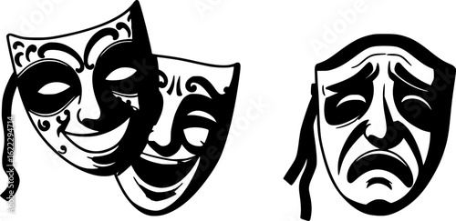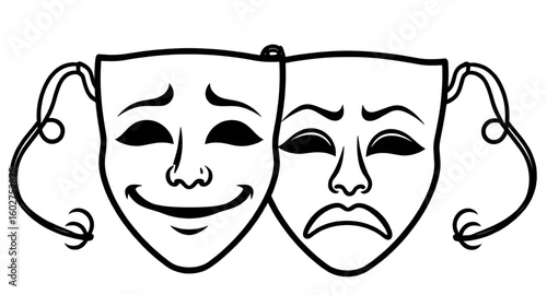 Comedy and tragedy masks illustration, theater emotion faces, dramatic performance symbols, happy sad expressions, classic drama art vector, black white masks