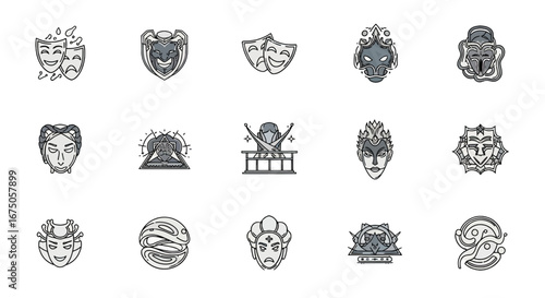 Collection of Stylized Theater Masks and Symbols in Gray Tones