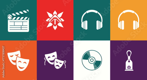 Entertainment and Performance Arts Icons Set: Film Clapperboard, Abstract Star, Comedy and Tragedy Theatre Masks on Colorful Quadrants., Flat Vector Elements, Vector Illustration, Simple Vector,