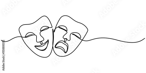 World theater day banner design, with character mask sketch, continuous one line drawing, vector illustration,  Theater mask tragedy and humor one line continuous line art. Character mask sketch.
