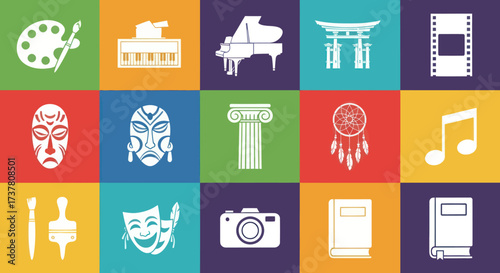 Diverse Art and Culture Icons Grid: Painting, Music, Theater, and Traditional Masks, Flat Vector Elements, Vector Illustration, Simple Vector, Stylized Vector Drawing, Vector Template, Clean Vector