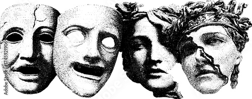 Theatrical masks collection: tragedy, comedy, neutral, and cracked art pieces with halftone effect