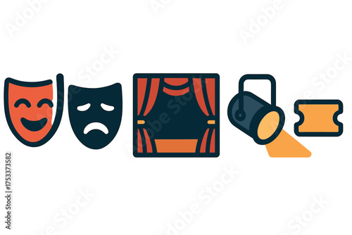 Theater icons featuring curtains, comedy and tragedy masks, and stage elements