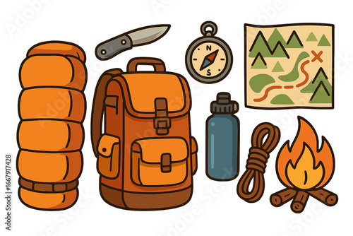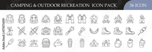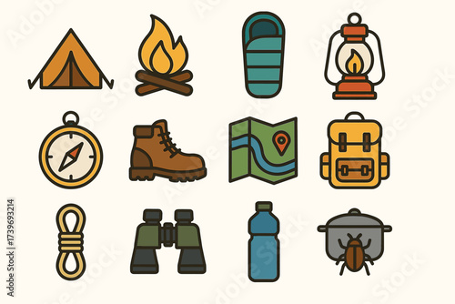 Icon set: outdoor gear essentials for hiking and adventure activities.