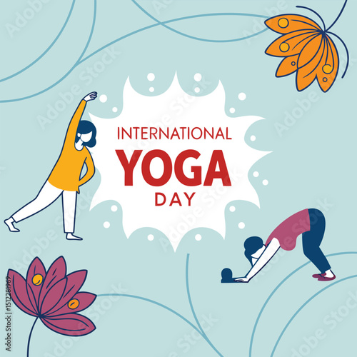 Illustrations of people performing various yoga poses, including downward-facing dog and tree pose.