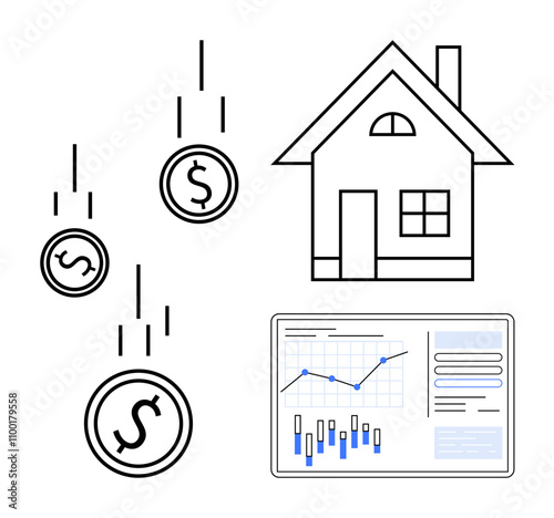 Line graph with blue data points on grid, falling coin, and phone icon with signals. Ideal for business, finance, communication, investment, statistics, economic analysis simple flat metaphor