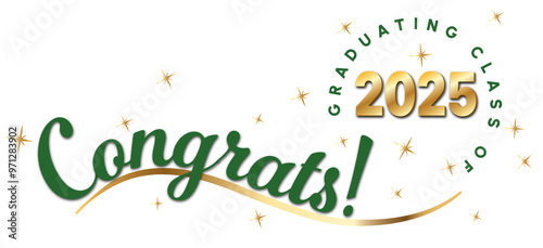 Celebratory Congrats! message for the graduating class of 2025, featuring green text and stars. Ideal for graduation announcements, invitations, and celebratory decor. On a white background.