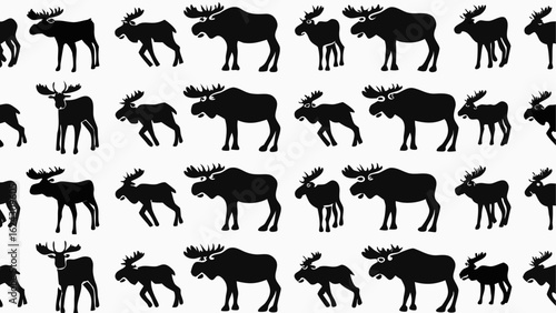 Silhouette pattern of moose in various poses arranged on a white background creating a dense composition