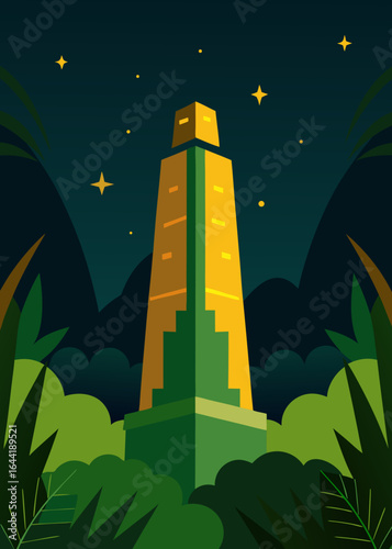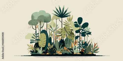 Lush tropical rainforest canopy with dense green foliage and palm trees in vibrant minimalist flat vector style illustration of jungle vegetation and natural environment