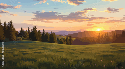 Golden sunset over rolling hills and a lush green meadow with a dense pine forest clouds golden hour.