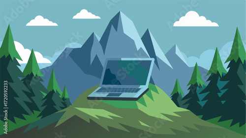 A laptop perched on a mosscovered rock surrounded by dense forests that lead up to snowcapped mountains in the distance.. Vector illustration