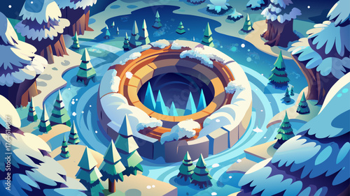 Very beautiful aerial view of a circular clearing surrounded by dense snowy forest trees, creating a perfect winter wonderland scene filled with symmetry, calmness, and the serene beauty of untouched