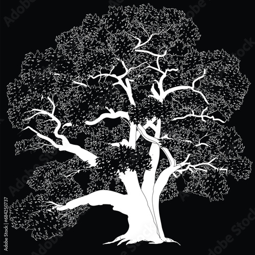 Silhouette of a majestic large tree with dense foliage and intricate branches spreading wide