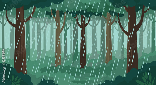 Cartoon illustration of rainfall in a dense forest featuring a lush green setting showcasing nature's power and serenity amid towering trees
