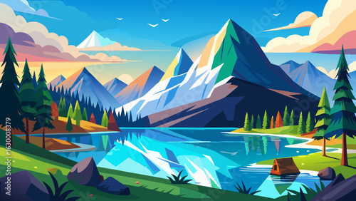 Vector art of a vibrant mountain landscape featuring snowdusted peaks, a sparkling blue lake reflecting the sky, and dense pine forests, perfect for outdoor exploration and scenic beauty