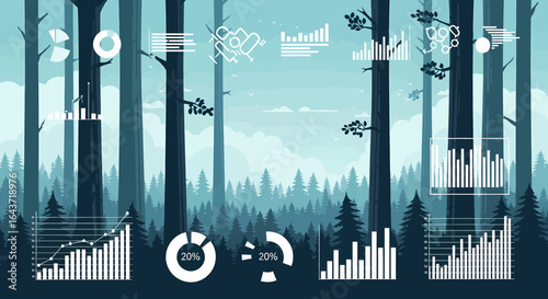 Ecological research data and forestry statistics visualized as infographics over a dense woodland landscape illustration.