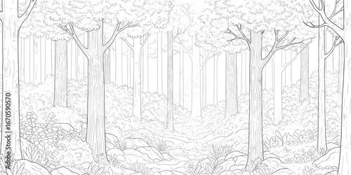 Detailed black and white line art illustration showcasing a serene, dense forest with towering trees and lush undergrowth, perfect for relaxation and creative coloring activities