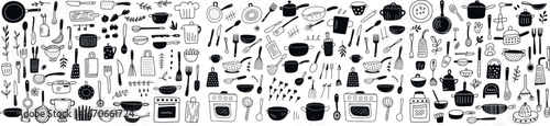 Dark seamless pattern featuring a dense collage of kitchen utensils and cookware silhouettes, including pots, pans, spoons, ladles, whisks, kettles, cups, knives, and appliances