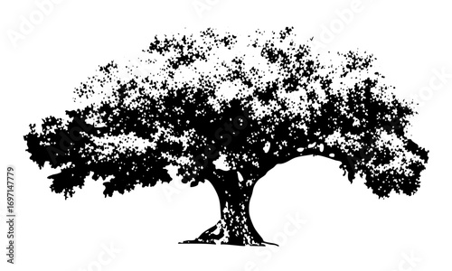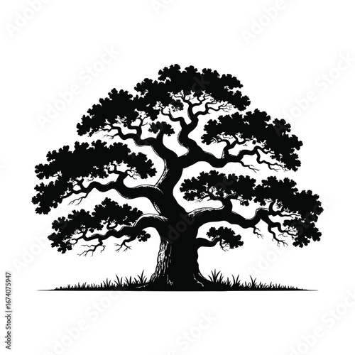 Solitary tree silhouette with dense foliage against a white background for ecological illustrations and nature-themed graphic design