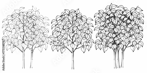 Three sketched trees with dense foliage and slender trunks in a black and white illustration style | editable eps vectors silhouette