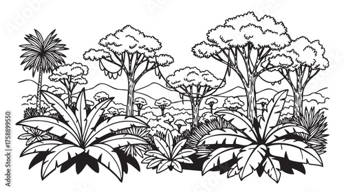 Black outline illustration of a dense tropical jungle with various trees and plants, showcasing overlapping foliage and layers of vegetation.