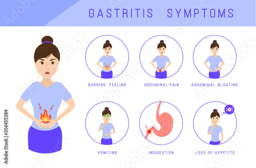 Gastritis vector infographic. Heartburn, heaviness, belching, nausea, flatulence, bloating, pain. Cartoon character. Isolated. Gastritis symptoms. Infographic elements