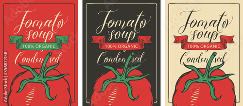 Vector banner, label, logo or emblem for tomato cream soup. Decorative illustration with inscription, a ripe half tomato in retro style