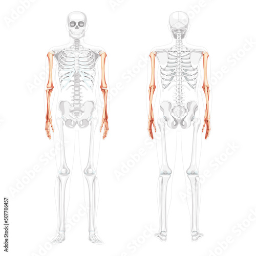 Skeleton Forearms Human radius, hand front back side view with partly transparent bones position. Set of Anatomically correct realistic flat Vector illustration of anatomy isolated on white background