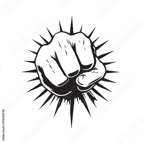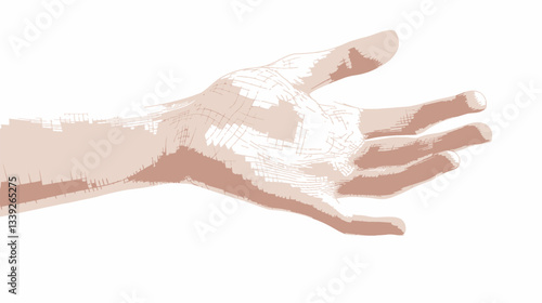 High-contrast black and white illustration of a hand and forearm reaching out.  The style is graphic, utilizing bold lines and shading to create texture and form. The image is stark and