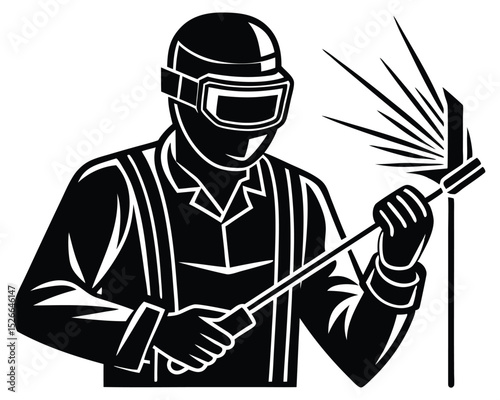 Graphic silhouette illustration of a welder wearing a helmet and protective gear, actively welding with sparks.