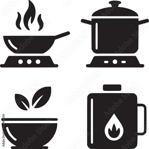 A collection of kitchen icons featuring a frying pan, pot, bowl with leaves, and a mug with a flame